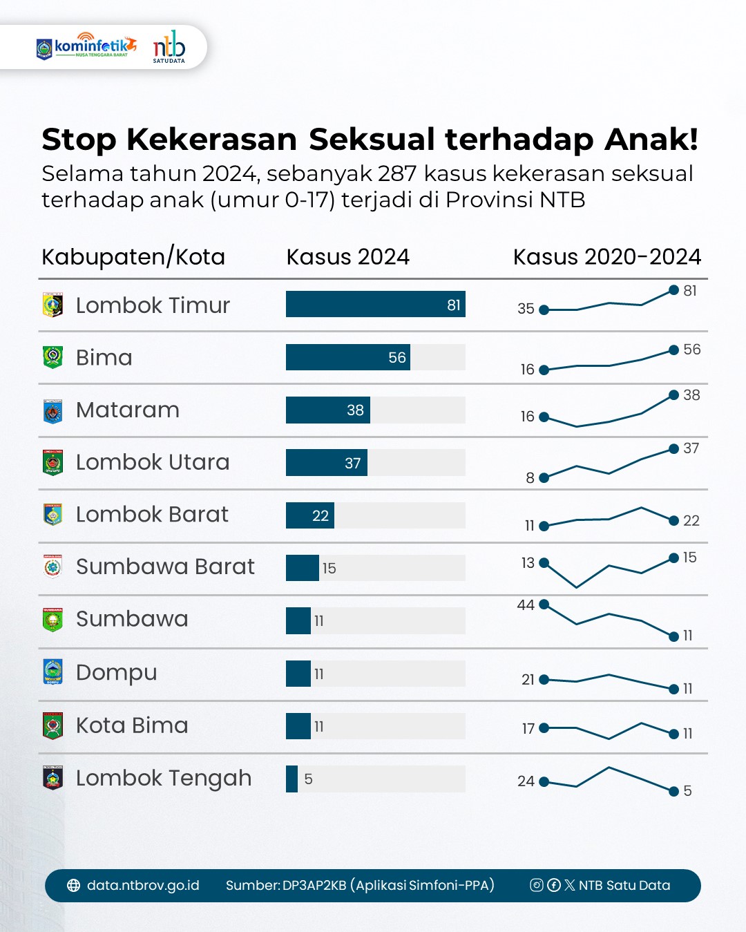 Sepanjang tahun 2024, tercatat 287 kasus kekerasan seksual terhadap anak (usia 0–17 tahun) di Provinsi Nusa Tenggara Barat.